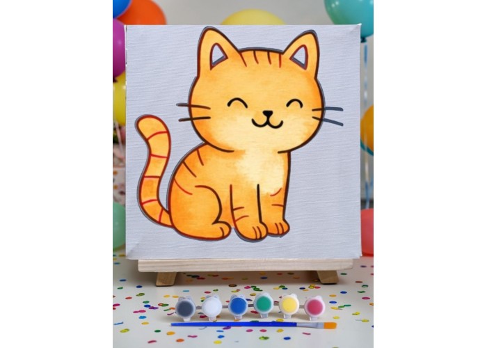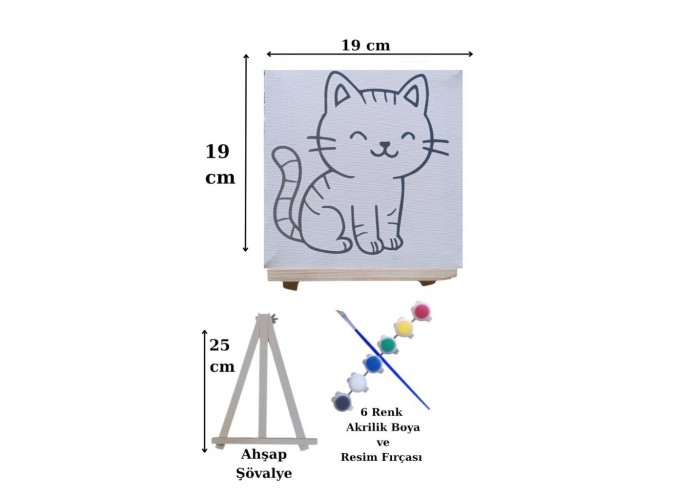 Çocuklar İçin Tuval Boyama Seti Kedi Mod2 19x19 Cm (Tuval, Şövale, Fırça ve 6 Renk Akrilik Boya Seti)