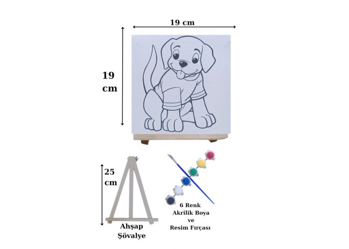 - Paket İçeriği 1 adet Baskılı 20x20 Cm Tuval, 1 Adet Şövale, 1 Adet Boya Fırçası ve 6 Renk Akrilik Boya Bulunmaktadır
