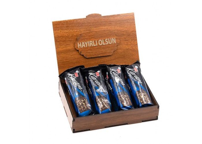 Sevdiklerinize Özel Ahşap Hediye Kutusunda 4 Adet Karam Gurme Bitter Çikolatalı ( Hayırlı Olsun Yazılı )