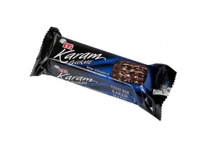 Eti Karam Gurme Bitter Çikolatalı Kremalı Gofret, çikolata sevenlerin, özellikle bitter çikolata tutkunlarının vazgeçilmezi olacak bir gofret. Kat kat gofret ve bitter çikolata kremasından oluşan Eti Karam, dışının tamamının bitter çikolatalı oluşu ile çikolata krizleri için birebir.