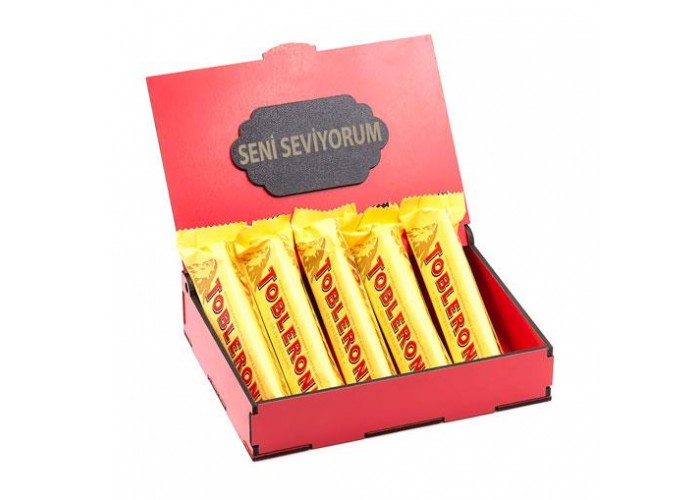 Sevdiklerinize Özel Kırmızı Ahşap Hediye Kutusunda 5 Adet Toblerone ( Seni Seviyorum Yazılı )