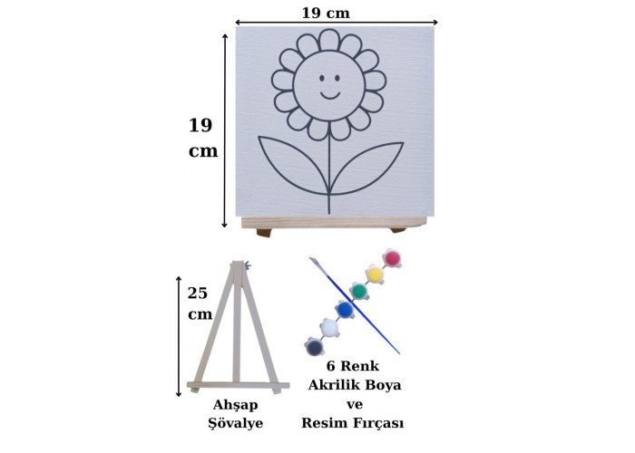 - Paket İçeriği 1 adet Baskılı 19x19 Cm Tuval, 1 Adet Şövale, 1 Adet Boya Fırçası ve 6 Renk Akrilik Boya Bulunmaktadır